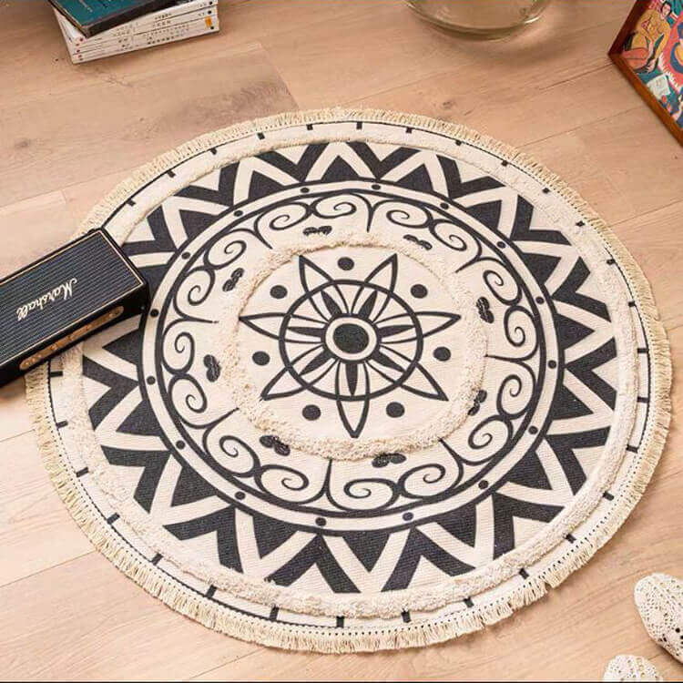 Round Moroccan Printed Cotton Area Rug with Tas... Round Moroccan Printed Cotton Area Rug with Tassel Hand Woven Machine Washable Floor Carpet Rug for Living Room Bedroom