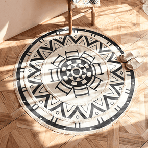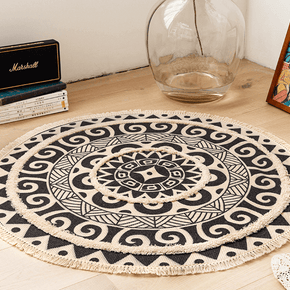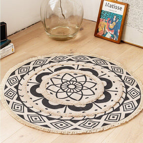 Round Black Printed Cotton Area Rug with Tassel Hand Woven Machine Washable Floor Carpet Rug for Living Room Bedroom Round Black Printed Cotton Area Rug with Tassel Hand Woven Machine Washable Floor Carpet Rug for Living Room Bedroom