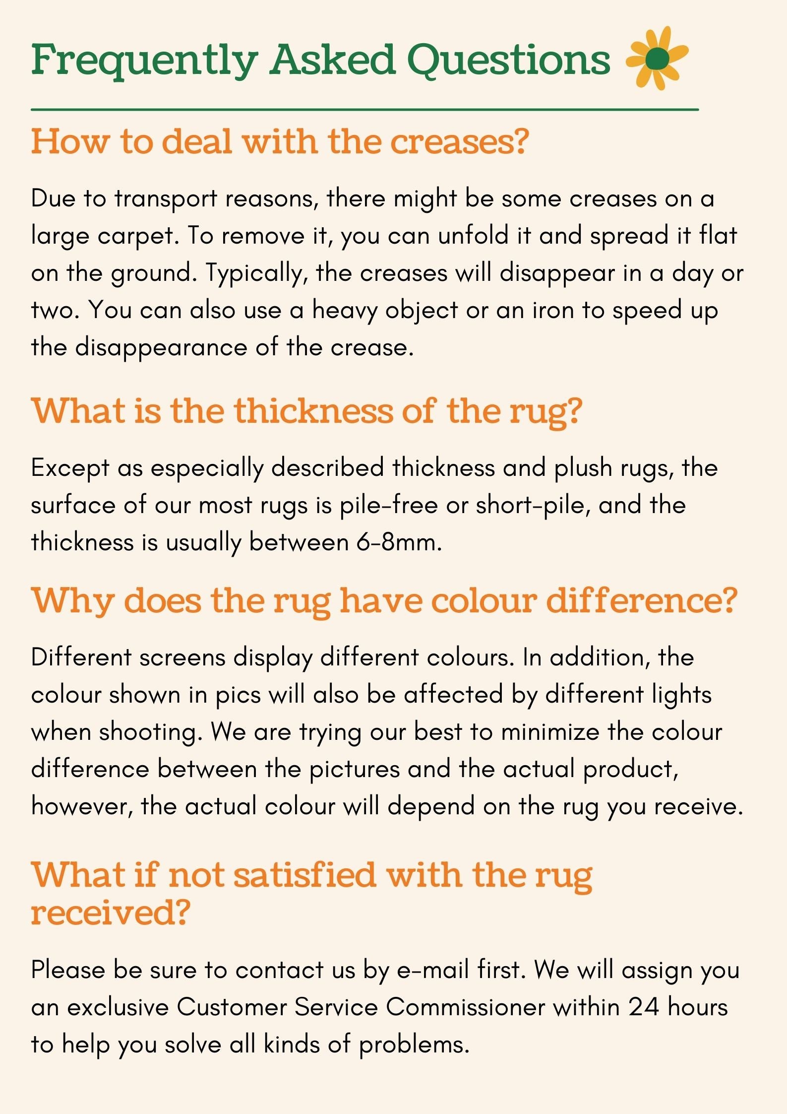 Note | 1. Please be aware that actual colours or sizes may vary slightly from given. 2. There might be a little crease on the large-size rugs due to transportation, please lay it flat for a few days to reduce the crease.Or to remove it quickly, you could put a dry towel over the creased area on a flat surface, and then iron over the towel with a low-steam setting. (The temperature should be no higher than 220/425¡§H.) |
