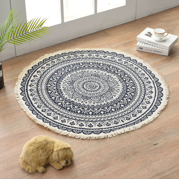 Black Round Cotton Woven Rug Mandala Boho Floor... Black Round Cotton Woven Rug Mandala Boho Floor Mat Living Room Bedroom Tasseled Foot Mat Yoga Cushion